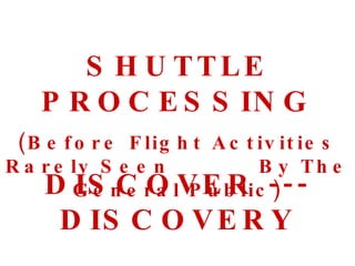 Before a space shuttle launch, several processing steps occur that are rarely seen by the public. The external tank arrives by barge and is lifted vertically in the VAB. Solid rocket boosters and engines are attached to the external tank. Meanwhile, the shuttle is attached to the external tank in the VAB. A payload is prepared and then moved to the launch pad to be inserted into the shuttle. Finally, the fully assembled shuttle and external tank are moved to the launch pad where final preparations are made for launch.