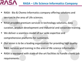 Rasa is a life sciences informatics company specializing in bio and chemo informatics, offering services such as technology solutions, data curation, and corporate training. The company aims to be a leader in life science informatics while providing state-of-the-art research and training facilities, having achieved recognition and completed various successful projects in the field. Rasa has received positive testimonials from clients for its effective training and contributions to in-silico drug discovery.