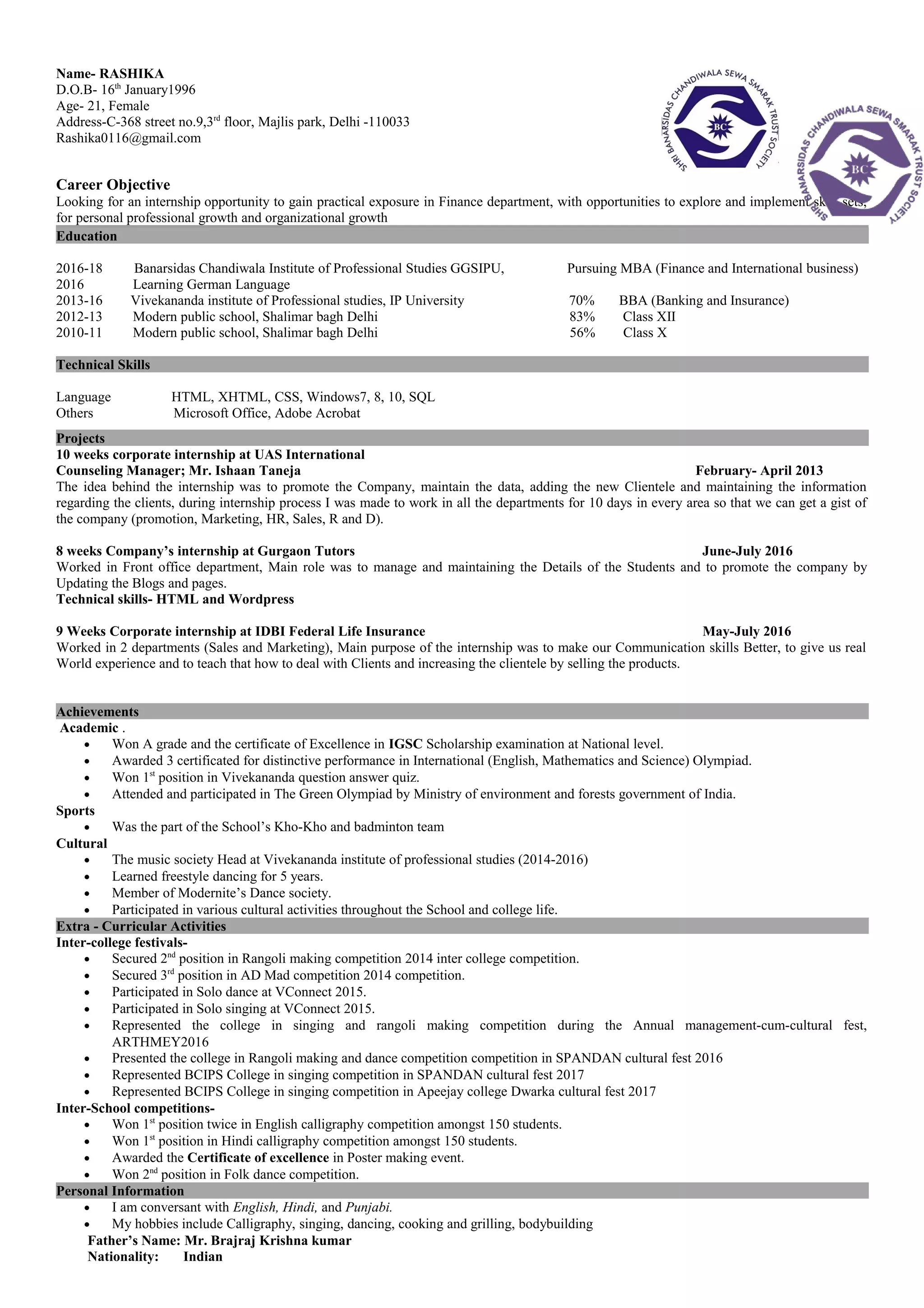 Rashika is a 21-year-old female pursuing an MBA in Finance and International Business. She has a BBA in Banking and Insurance and is seeking an internship opportunity in the finance department to gain practical experience and further her professional development. Her education includes studies at Banarsidas Chandiwala Institute of Professional Studies and Vivekananda Institute of Professional Studies. She has technical skills in languages like HTML, CSS, and Microsoft Office. Rashika has completed internships at UAS International, Gurgaon Tutors, and IDBI Federal Life Insurance, gaining experience in various departments. She lists her academic and extracurricular achievements which include winning competitions and representing her college in cultural festivals.