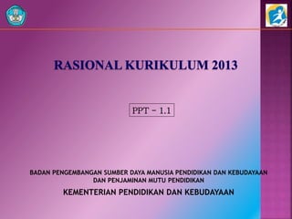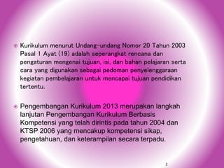 Dokumen ini membahas pengembangan kurikulum 2013 yang merupakan kelanjutan dari kurikulum berbasis kompetensi yang dimulai pada tahun 2004 dan KTSP 2006. Kurikulum ini bertujuan untuk meningkatkan kualitas pendidikan di Indonesia dengan menekankan kompetensi lulusan, pengelolaan, dan tantangan internal serta eksternal yang dihadapi. Selain itu, terdapat pemikiran mengenai kompetensi masa depan serta penguatan proses pembelajaran melalui pendekatan yang berbasis pada partisipasi aktif siswa.