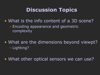 The document discusses using coded masks and modulation techniques to capture light field information and enable digital refocusing and 6D displays with a single 2D sensor. It proposes placing a coded mask in front of the sensor to heterodyne the light field and extract its 4D information. Several applications are mentioned, including coded illumination for motion capture, a 6D display using spatial and illumination variation, and a light field camera that can digitally refocus using a single photograph.