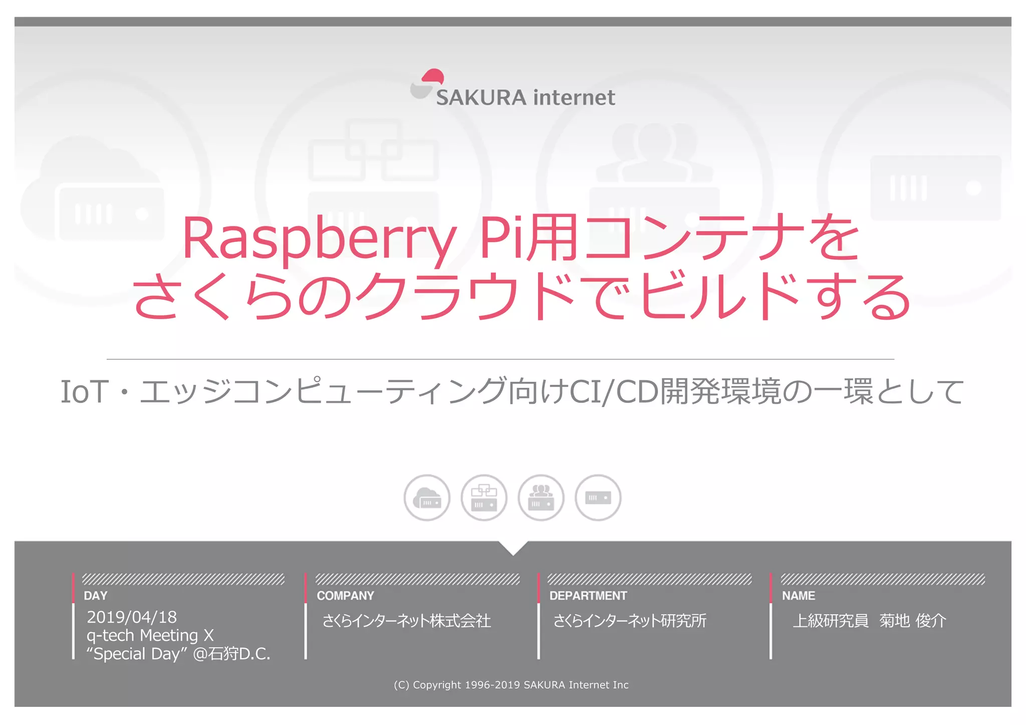 Raspberry Pi⽤コンテナを さくらのクラウドでビルドする IoT・エッジコンピューティング向けCI/CD開発環境の⼀環として 2019/04/18 q-tech Meeting