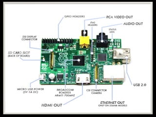 The Raspberry Pi is a credit-card sized computer that can connect to keyboards, monitors and TVs to function similarly to a desktop computer. It was developed by the Raspberry Pi Foundation in the UK to inspire teaching of basic computer science in schools and develop interest in programming. While low in cost at $25-35, the Raspberry Pi runs Linux and can be used for a variety of applications including robotics, programming practice and basic computing tasks.