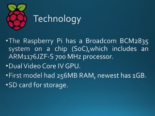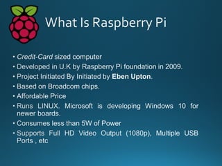 The document provides information about a student named SHUJAAHMAD in the 5th semester with roll number 1422. It then discusses the Raspberry Pi, a credit card-sized computer developed by the Raspberry Pi Foundation, a UK-registered charity, to help develop computer science skills for kids with limited access to computers. It aims to teach children not just how to use computers but how they work and how to program them. The Raspberry Pi comes in several models including the original Raspberry Pi as well as the Raspberry Pi 2 Model B and Raspberry Pi 3.