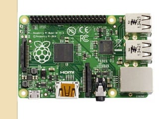 This document provides an introduction and overview of the Raspberry Pi. It discusses that the Raspberry Pi is a credit card-sized computer that can be used for applications ranging from word processing to gaming. It uses a low-power System on Chip and supports Linux. Key features include GPIO pins, USB ports, audio/video output, and support for a camera module. The document also provides instructions on setting up a Raspberry Pi, including downloading an operating system, installing it on an SD card, and booting up the Raspberry Pi for the first time. It describes how to use the on-board camera and control relays using GPIO pins.