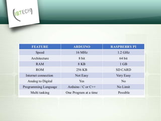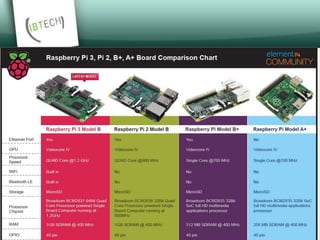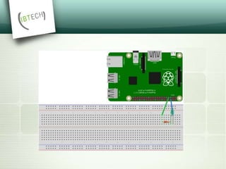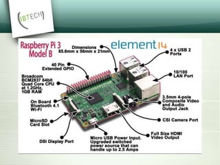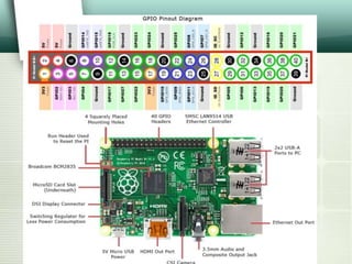 The document discusses the Raspberry Pi, a small, inexpensive computer that can run various operating systems like Raspbian, Arch Linux, and Windows 10 IoT Core. It has 40 GPIO pins that allow users to connect external circuits and boards to control them using code. Example projects built with Raspberry Pi are described, such as a home media server, baby monitor, network-wide ad blocker, customized picture frame, automated pet feeder, and more.