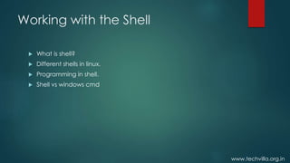 The document provides an overview of shell usage in Linux, explaining its role as an interface between the user and the operating system. It covers shell basics, including commands, scripting, piping, redirection, and environment variables, as well as comparisons with Windows CMD. Key functionalities include job routing, working with scripts, and managing file outputs efficiently.