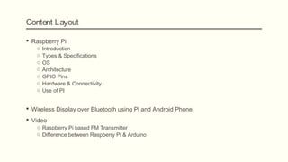 Raspberry Pi is a single board computer that is about the size of a credit card. It has various ports and connections that allow it to be used for many purposes like media center, office tasks, programming, and more. It uses Linux operating systems and can control physical devices like servos through its GPIO pins using Pulse Width Modulation. The document describes connecting a servo to the Raspberry Pi GPIO pin and using the WiringPi library to send PWM signals to control the servo position.