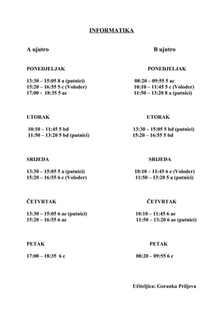 The document contains a schedule for informatika classes for two groups, A and B, for each day of the school week. It lists the start and end times for classes on Mondays, Tuesdays, Wednesdays, Thursdays and Fridays for each group, as well as the class and teacher for each time slot.