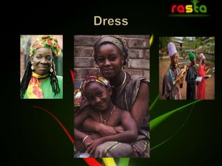 Rastafarianism developed in 1920s-30s Jamaica as a response to poverty, racism, and oppression. It was founded on the teachings of Marcus Garvey who advocated black pride and a return to Africa. Rastafarians worship Haile Selassie, the former emperor of Ethiopia, as God incarnate. They use marijuana sacramentally and follow traditions including dreadlocks, the colors red, gold, and green, and nyabinghi drumming ceremonies. The movement was established by Leonard Howell, Archibald Dunkley, and Joseph Hibbert in the hills of St. Thomas, Jamaica in the early 1930s.