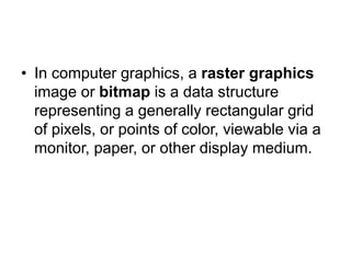 Raster graphics are represented by a grid of pixels stored in an image file. The image is characterized by its width, height in pixels and color depth. Raster images correspond bit-for-bit to what is displayed on screen and stored in video memory. The word raster comes from the Latin word for rake, originally referring to the line-by-line scanning of CRT video monitors.