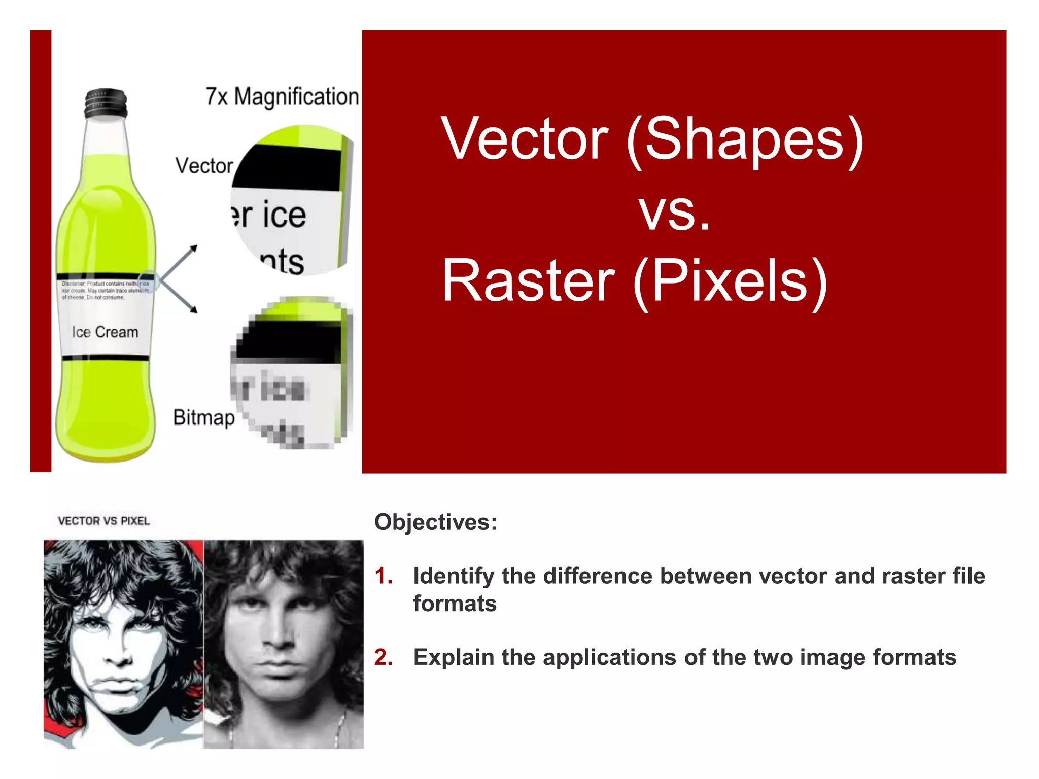 Vector images use mathematically defined points and paths to represent shapes and lines, allowing them to be scaled to any size without loss of quality. Raster images represent shapes and colors using a grid of pixels, so increasing size causes pixels to become visible. Common vector formats are AI, EPS, and SVG, while common raster formats are JPEG, PNG, and GIF. Vector programs like Illustrator are best for solid colors and text, while raster programs like Photoshop are needed for photos with complex effects. Raster images can be traced in vector programs to convert them.