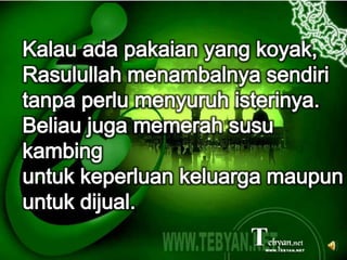 Dokumen ini menggarisbawahi kehidupan Rasulullah SAW yang penuh dengan rasa tawadhu' dan perhatian terhadap keluarganya. Ia melakukan tugas rumah tangga, menunjukkan kepedulian kepada orang lain dalam kesederhanaan, dan tetap beribadah meskipun dalam keadaan lapar. Prinsipnya adalah untuk menjadi hamba Allah yang bersyukur dan tidak menjadikan kedudukan tinggi sebagai alasan untuk merasa lebih dari yang lain.