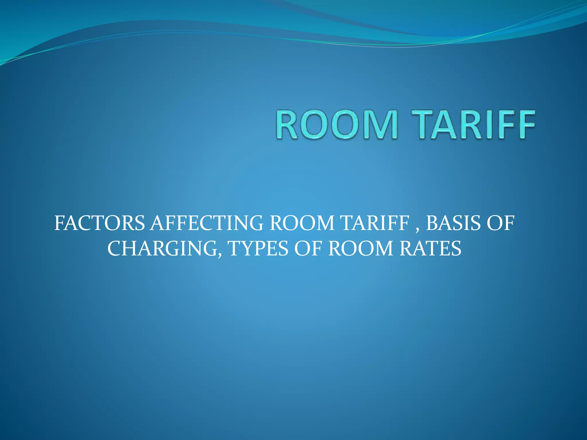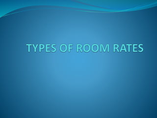 The document discusses factors that affect hotel room rates, including cost, competition, target market, location, and level of services provided. It also outlines different bases for charging room rates such as fixed check-in/check-out times, 24-hour basis, and nightly basis. Special rates are also discussed, including rates for companies, packages, off-season, employees, travel agents, groups, children, and extra guests.