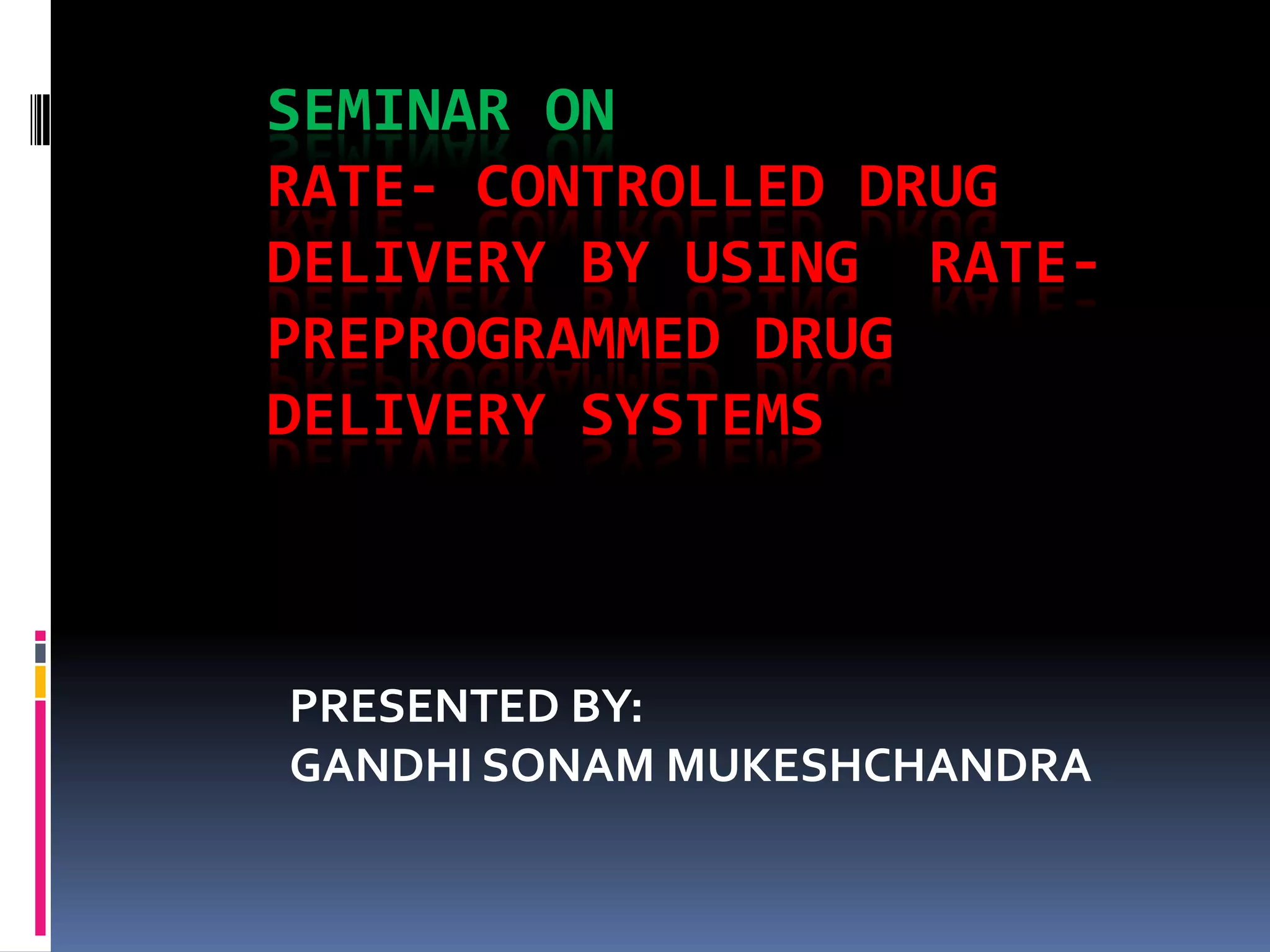 The document summarizes a seminar on rate-controlled drug delivery using preprogrammed drug delivery systems. It describes different types of rate-preprogrammed systems including polymer membrane permeation systems, polymer matrix diffusion systems, and micro reservoir partition systems. It also discusses activation-modulated drug delivery systems that use physical, chemical, or biological means like osmotic pressure, hydrodynamic pressure, magnetism, or ultrasound to activate and control drug release. Specific examples of commercial drug delivery systems are provided for different technologies.