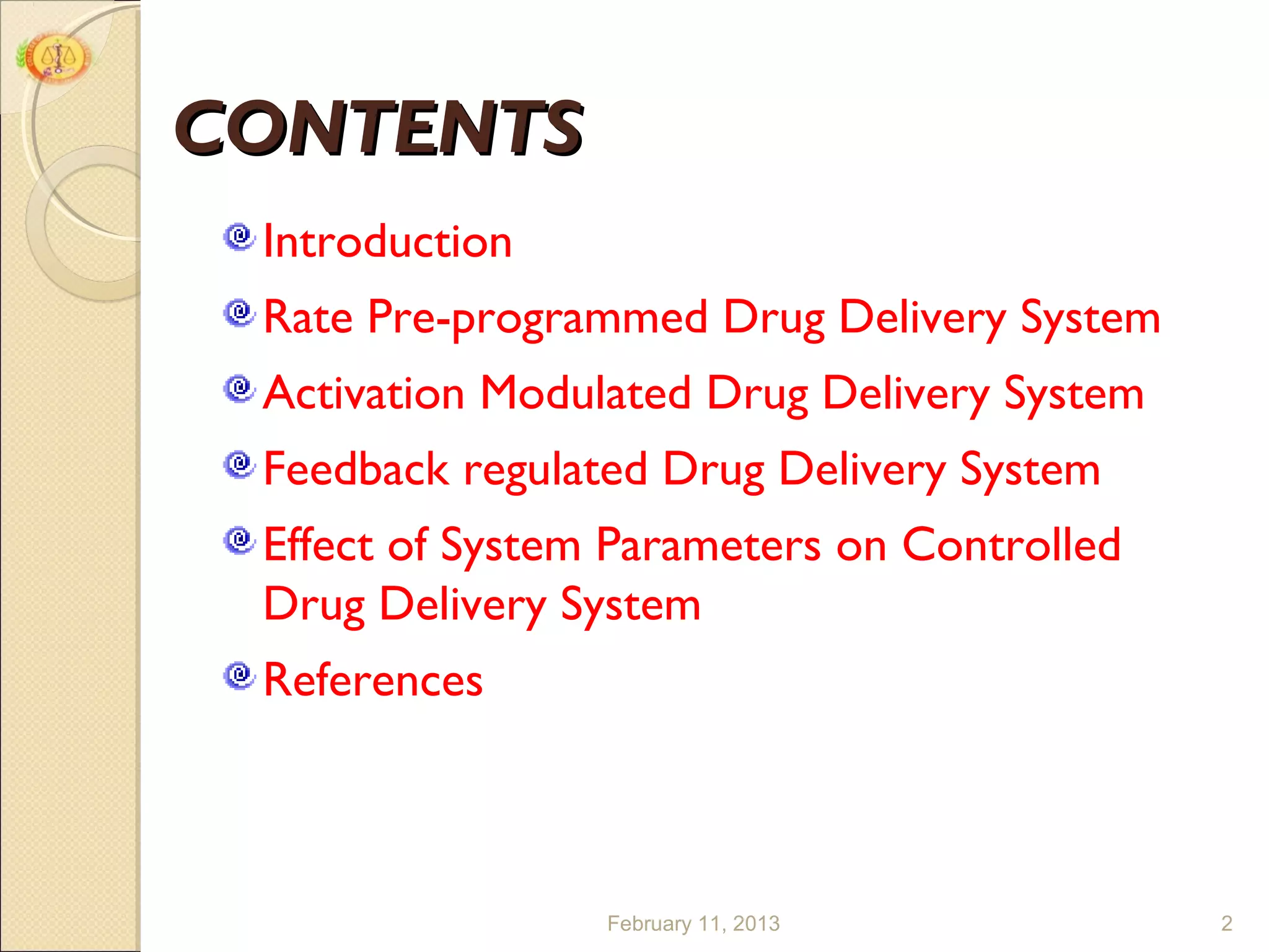 The document discusses different types of rate-controlled drug delivery systems. It begins with an introduction to sustained and controlled release drug delivery. There are three main types of rate-controlled systems: rate preprogrammed systems where the drug release rate is predetermined; activation-modulated systems where a stimulus triggers drug release; and feedback-regulated systems where a sensor detects drug levels and modulates release accordingly. Specific examples like transdermal patches are provided for each system type. Drug release rates are controlled by factors like membrane permeability, polymer solubility, and drug diffusivity.
