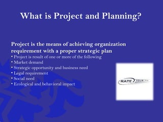 This document discusses project management and the PMP certification. It defines what a project is and some common issues that arise in projects. It then discusses how project managers can help organizations meet their goals by resolving issues, optimizing performance, and directing the organization. The document outlines reasons to become PMP certified such as demonstrating expertise, gaining networking opportunities, and increasing salary and job prospects. It also discusses options for obtaining PMP certification and the benefits of being certified.