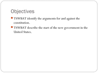 - There was debate over how much power to give the federal government versus retaining power for the states. The Federalists favored a stronger national government while the Anti-Federalists wanted to preserve more state power and autonomy.