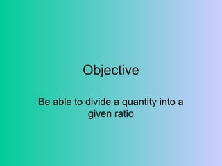 The document explains how to divide a quantity into a given ratio. It defines what a ratio is as a way to compare the relative sizes of two or more quantities. It then demonstrates how to divide a total quantity by the total parts in the ratio to get the amounts for each part, using the example of dividing 560kg into a 3:4 ratio to get amounts of 240kg and 320kg. Finally, it provides examples of dividing various quantities into different ratios.