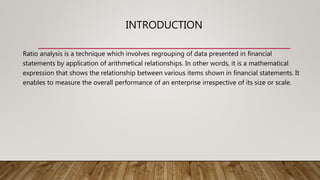 Ratio analysis is a technique that involves regrouping financial statement data through mathematical calculations of relationships between items. It allows measurement of a company's overall performance regardless of size. Ratios are classified into liquidity, solvency, efficiency, and profitability ratios. Liquidity ratios measure short-term financial obligations, solvency ratios long-term financial position, efficiency ratios use of assets/liabilities, and profitability ratios ability to generate revenue. Key ratios discussed include current ratio, quick ratio, debt-equity ratio, gross profit ratio, return on capital employed, and earnings per share.