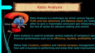 The document discusses ratio analysis, a technique used to interpret financial statements for evaluating a company's operational and financial performance. It explains various types of ratios including profitability, liquidity, turnover, valuation, and leverage ratios, providing examples and methods for computation. Additionally, it highlights the importance of these ratios in assessing business efficiency, profitability, and financial stability for decision-making by investors and management.