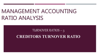 The document provides a detailed overview of management accounting ratio analysis, particularly focusing on turnover ratios, which assess the efficiency of a firm in utilizing its financial assets and liabilities to generate revenue. It elaborates on various types of turnover ratios including the creditors turnover ratio and its calculation, as well as the concept of the average payment period for evaluating payment efficiency to vendors. Additionally, practical examples and formulas for calculating these ratios are included to aid understanding.