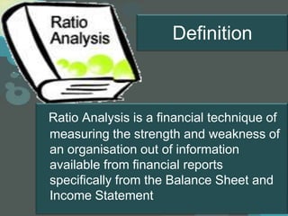 Ratio analysis is a technique that measures the financial strength and weaknesses of an organization using ratios calculated from information in the balance sheet and income statement. There are various types of ratios that serve different purposes, such as liquidity ratios that measure short-term solvency, activity ratios that measure efficiency, and profitability ratios that measure long-term performance. While ratios provide quantitative measures, they also have limitations such as being based on historical data and different interpretation.