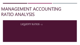 The document discusses management accounting ratio analysis, focusing on liquidity ratios which assess a company's ability to meet short-term obligations. It defines various financial ratios, including current, quick, cash, and stock to working capital ratios, explaining their calculations and interpretations. Additionally, the document provides examples and problems for calculating current assets, current liabilities, and other financial metrics.