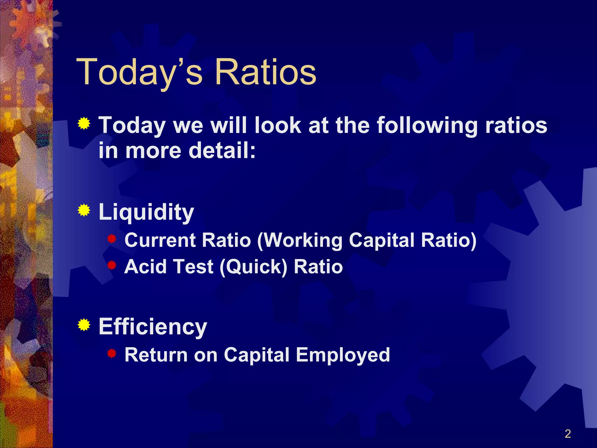 This document discusses and provides details on several key financial ratios used to analyze business performance, including the current ratio, acid test (quick) ratio, and return on capital employed (ROCE).