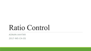 Ratio control is a feed-forward control scheme that measures and maintains a constant ratio between two disturbances (loads), usually flow rates. It is commonly used to control the ratio of reactants entering a reactor, the reflux ratio in distillation columns, and the fuel/air ratio in burners. Ratio control allows linking two streams to produce and maintain a defined ratio simply without needing a complex model. However, it assumes the correct ratio is maintained by controlling only one measured flow rate.