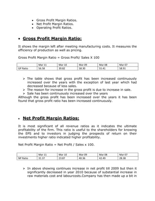 This document discusses ratio analysis and its uses. Ratio analysis involves calculating and interpreting various financial ratios to evaluate aspects of a company's performance like profitability, liquidity, efficiency, and financial stability. The document outlines different types of ratios including profitability ratios like gross profit margin, net profit margin and return on assets. It also discusses liquidity ratios like current ratio and quick ratio. Finally, it covers finance structure ratios such as debt-equity ratio and debt ratio that measure a company's use of leverage. Specific examples and interpretations of these ratios are provided for a sample company over several years.