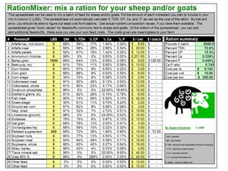 This document discusses ration balancing software options for sheep. It begins by explaining why ration balancing is important to meet nutritional requirements and maximize animal performance while managing costs. There are several methods for ration balancing, including by hand or using computer programs. When using computer programs, the most common method is substitution, where feeds are edited until nutritional requirements are met. The document then reviews several free and paid ration balancing software and spreadsheet options, comparing their features such as whether they require Excel or Access, use of substitution method, and ability to perform least cost formulation.