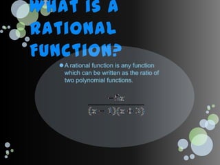Rational functions are any functions that can be written as the ratio of two polynomial functions. There are two types of asymptotes for rational functions: vertical asymptotes, which occur at the zeros of the denominator and cannot be crossed, and horizontal asymptotes, which can be crossed. To find the vertical and horizontal asymptotes of a rational function, you examine the degrees of the numerator and denominator polynomials. The domain of a rational function is the set of x-values that make the function defined, while the range is the set of possible y-values produced by the function.