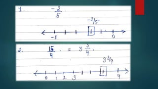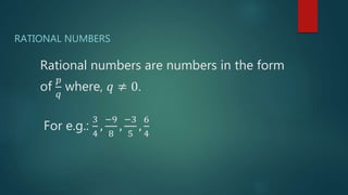 The document discusses rational numbers, defined as numbers in the form of p/q where q ≠ 0, covering properties such as closure, commutative, associative, and distributive properties for addition, subtraction, multiplication, and division of rational numbers. It explains multiplicative and additive identities, inverses, and how to represent rational numbers on a number line, including finding rational numbers between given values. Additionally, it includes practice questions to reinforce understanding of these concepts.