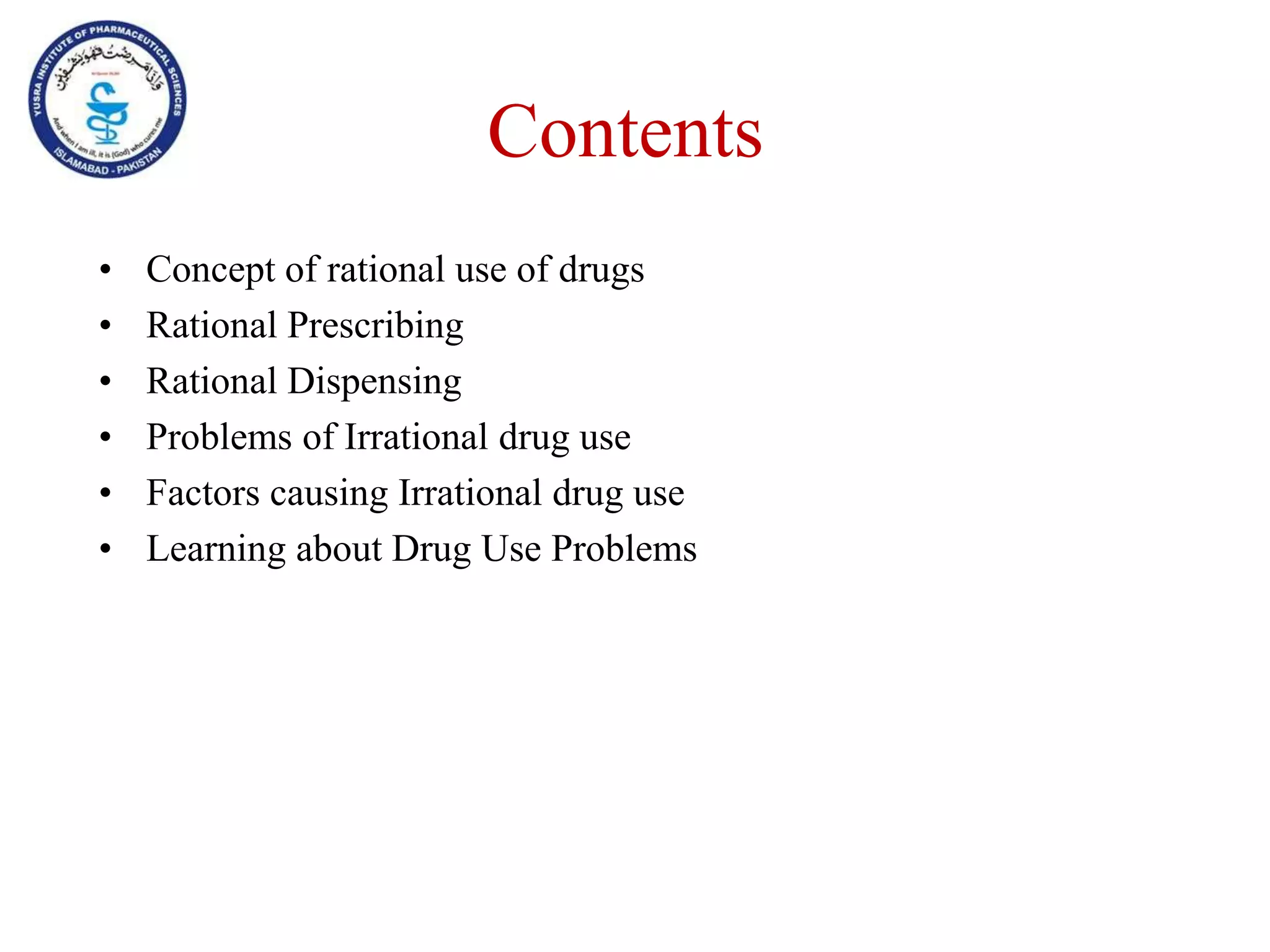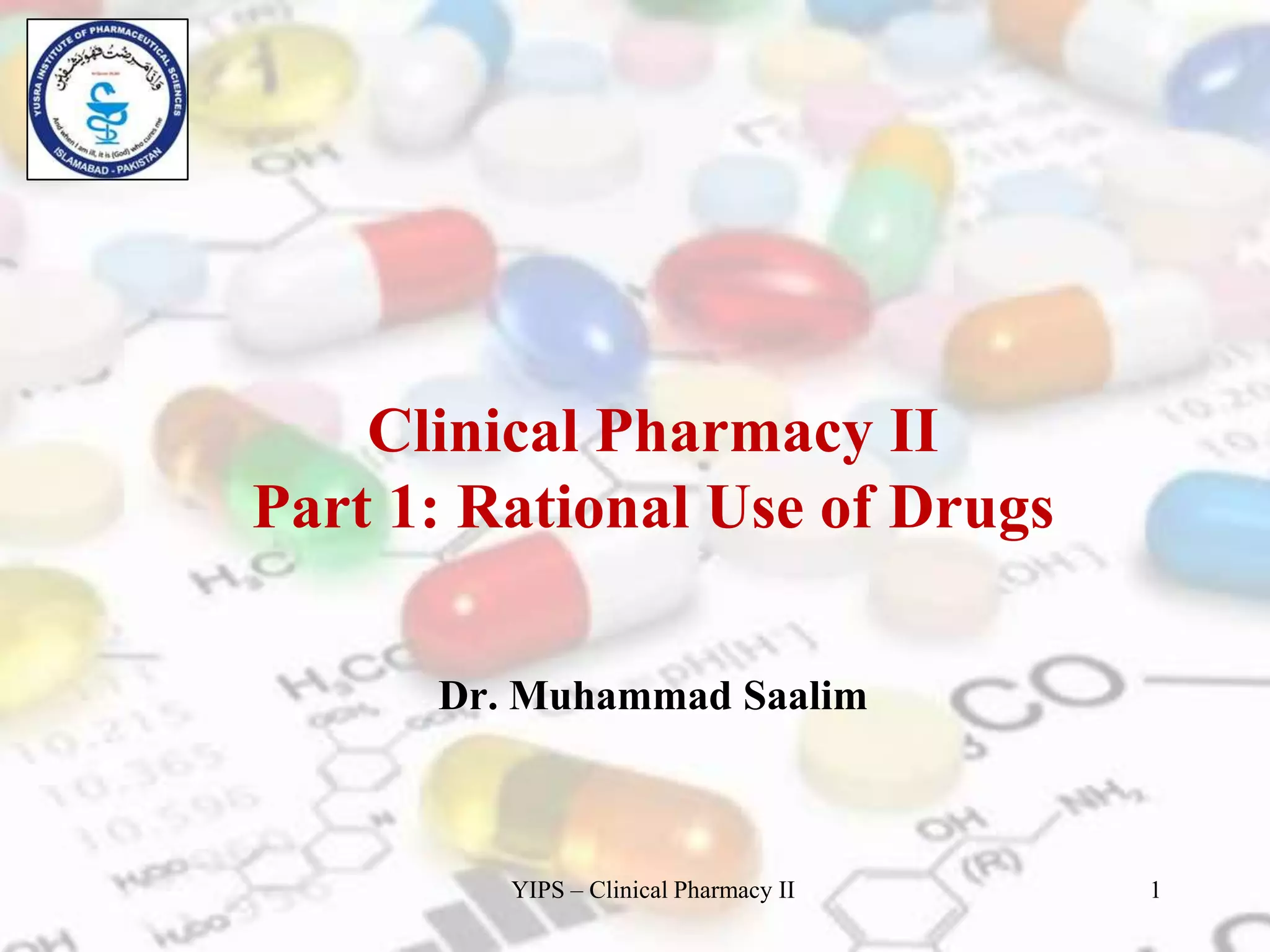 This document outlines the topics that will be covered in the Clinical Pharmacy II course, including rational use of drugs, rational prescribing, rational dispensing, problems of irrational drug use, and factors causing irrational drug use. It provides the course contents, marking scheme, topics to be covered, and expected learning outcomes. The key areas of focus for rational use of drugs are ensuring patients receive appropriate medications to meet their clinical needs at the lowest possible cost. Rational prescribing involves selecting drugs based on safety, effectiveness, tolerability, price and simplicity, while rational dispensing aims to provide patients with adequate counseling and instructions for proper medication use. Irrational drug use can result from improper prescribing, dispensing, or non-adherence and lead to negative