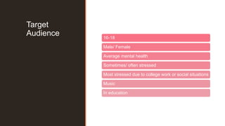 This document outlines an idea for a TV advertising campaign to promote mental health and coping strategies for stressed students aged 16-18. The proposed ad would tell a story of a student experiencing stress from schoolwork shown through black and white imagery and static noise, who then finds relief and color when putting on headphones and listening to music. The goal is to create an emotionally impactful and relatable ad that highlights healthy coping mechanisms like music for stressed youth audiences.
