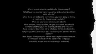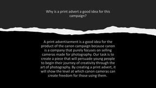 The document describes the rationale for a print advertisement idea. The idea is to portray family memories by digitally drawing over old photos in different colors, shapes, and patterns. This allows the opportunity to promote Canon cameras while also expressing creativity. The black and white photos with colorful drawings added will convey feelings and give the ad visual appeal. The ad aims to attract audiences by taking a positive, emotional approach to representing family memories rather than a sadder route.