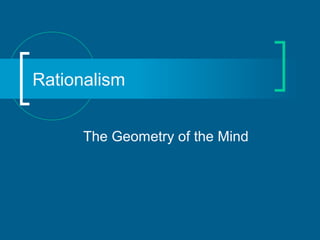 This document discusses the differences between rationalism and empiricism in epistemology. Rationalism holds that there are innate ideas that cannot come from experience alone, while empiricism believes that all knowledge comes from sensory experience. Key rationalist philosophers discussed include Descartes, Spinoza, and Leibniz. Descartes used rational intuition and deduction to establish certainty. Spinoza believed God, nature, and mind were one substance. Leibniz argued against the tabula rasa view and proposed parallelism between mind and body with preestablished harmony.