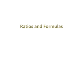 This document lists formulas for various financial ratios used to analyze a company's liquidity, capital structure, solvency, return on investment, operating performance, and asset utilization. Ratios included are the current ratio, quick ratio, cash flow margin ratio, collection period, inventory turnover, debt-to-equity ratio, times interest earned, return on capital employed, gross profit ratio, and total assets turnover among others. Formulas provided calculate metrics like current assets to current liabilities, EBITDA to debt payments, net income to average assets, and sales relative to working capital.