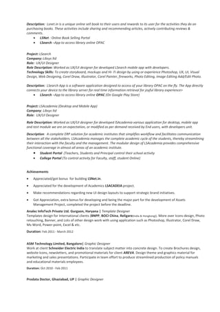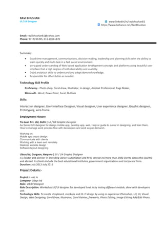 Ravi Bhushan is a skilled UI/UX designer with expertise in web-based application development, interaction design, and visual design tools such as Photoshop and Illustrator. He has experience leading design projects for mobile and desktop applications in various companies, with notable projects including lsnet.in and lsacademia while also mentoring junior designers. Ravi holds an advanced diploma in computer applications and is recognized for his contributions and achievements in design projects.