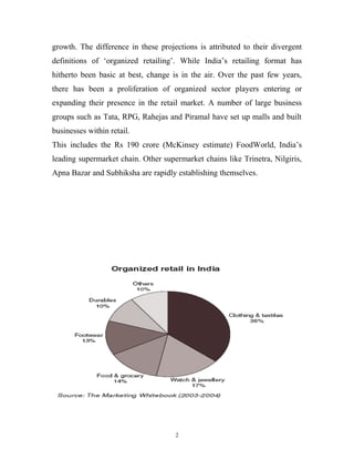 The retail industry in India is large and growing, accounting for about 11% of GDP. The organized retail sector makes up only 3.5% of the total retail market but has been growing over 30% annually. Major players have entered the Indian retail market, developing stores like supermarkets, hypermarkets, and shopping malls. However, the retail sector in India remains highly fragmented with many small, traditional stores that will be difficult for organized retailers to compete with. As incomes and lifestyles change in India, the retail sector is expected to continue expanding rapidly.