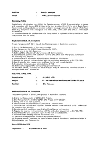 This document is a curriculum vitae for Ravi Ranjan. It summarizes his professional experience, education, areas of expertise, and personal details. Ravi has over 6 years of experience in project management roles for infrastructure projects in transmission and distribution. He is currently a Project Manager at Gupta Power Infrastructure Ltd, managing substation projects. Previously he has worked at Siemens, Vijai Electricals, and Instrumentation Incisive Technologies in various project management and engineering roles.