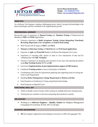 The document provides a summary of a Software Test Engineer's professional experience, skills, and qualifications. It summarizes 4 years of experience testing ERP and web applications using manual and database testing methods. Specific experiences include testing software development lifecycles, designing and executing test cases, defect reporting and management, requirements gathering, and training. Technical skills include languages like C/C++ and VB, testing tools like QC and BTS, and databases like Oracle. Educational background includes an MCA.