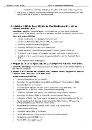 This resume is for Ravi Kumar Rathore, who has over 5 years of experience in IT support roles. He has worked as a system administrator and desktop support engineer for various companies in Delhi. Some of his responsibilities have included managing Windows server domains, networking equipment, email servers, and providing technical support to users. He has technical skills in Windows server, networking, Cisco routers, and several Microsoft and Linux applications. He holds an MCSE certification and diplomas in computer hardware and networking. He is looking for a new opportunity as a desktop support engineer or system administrator.