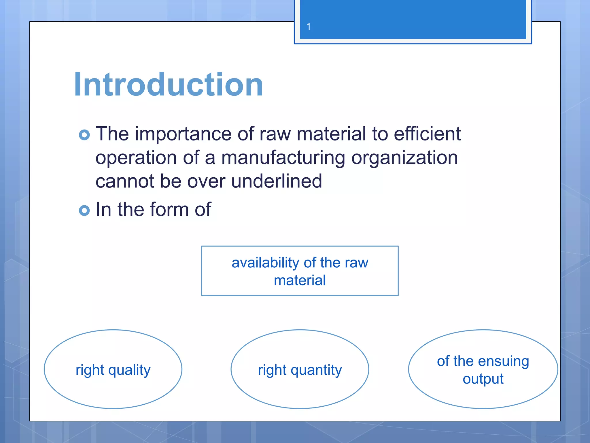1) Efficient raw material management is critical to the overall performance of a manufacturing organization. It involves determining economic order quantities, re-order levels, and minimum/maximum stock levels.