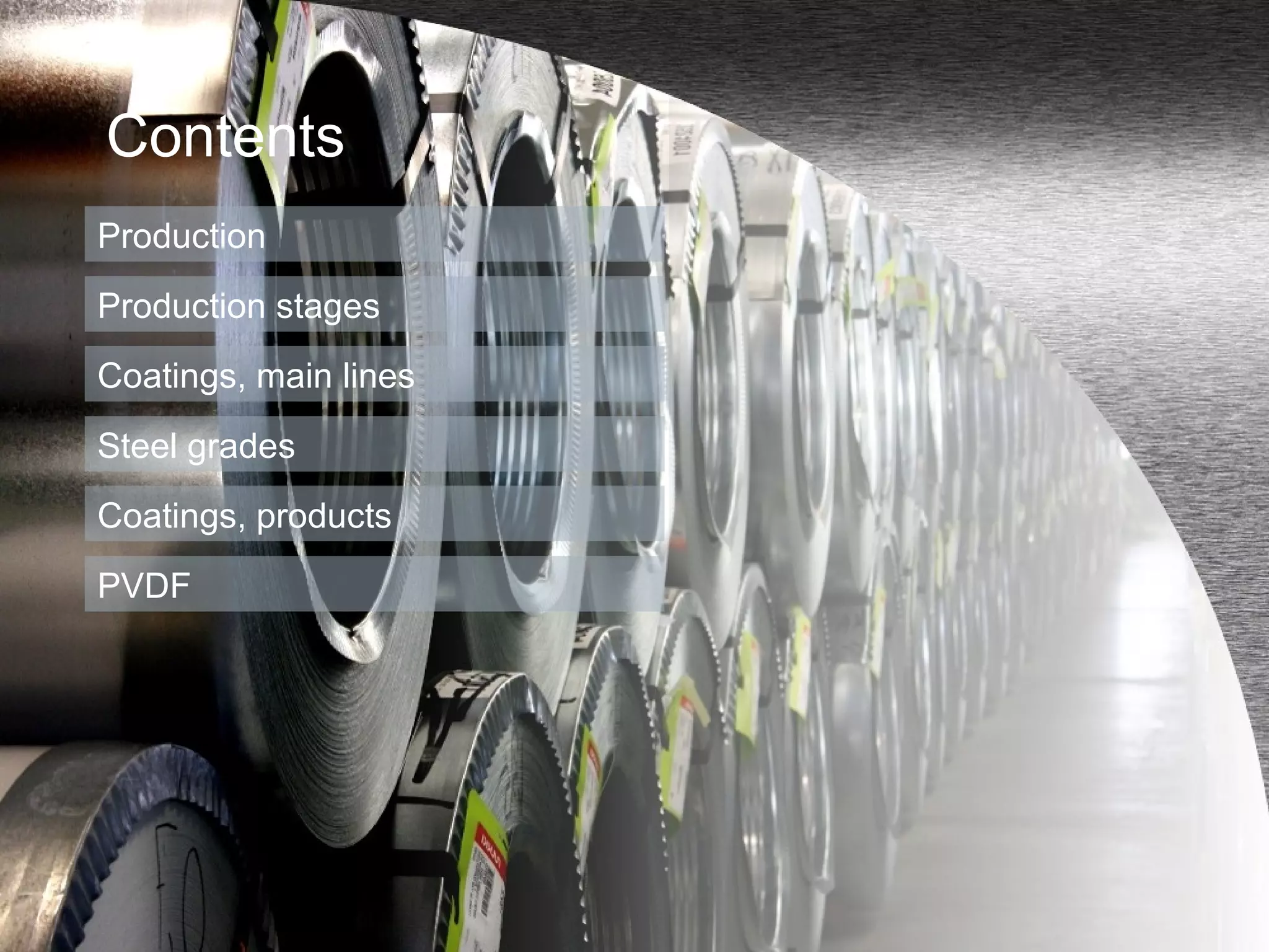 The document outlines the production processes and materials involved in manufacturing coil coated steel, highlighting various coatings such as zinc, Galfan®, and PVC laminate. It details the production stages, including cold rolling, metal coating, and coating options tailored for different applications to ensure quality and performance. Additionally, the document lists steel grades and their specific applications, emphasizing the importance of material properties in various industrial contexts.