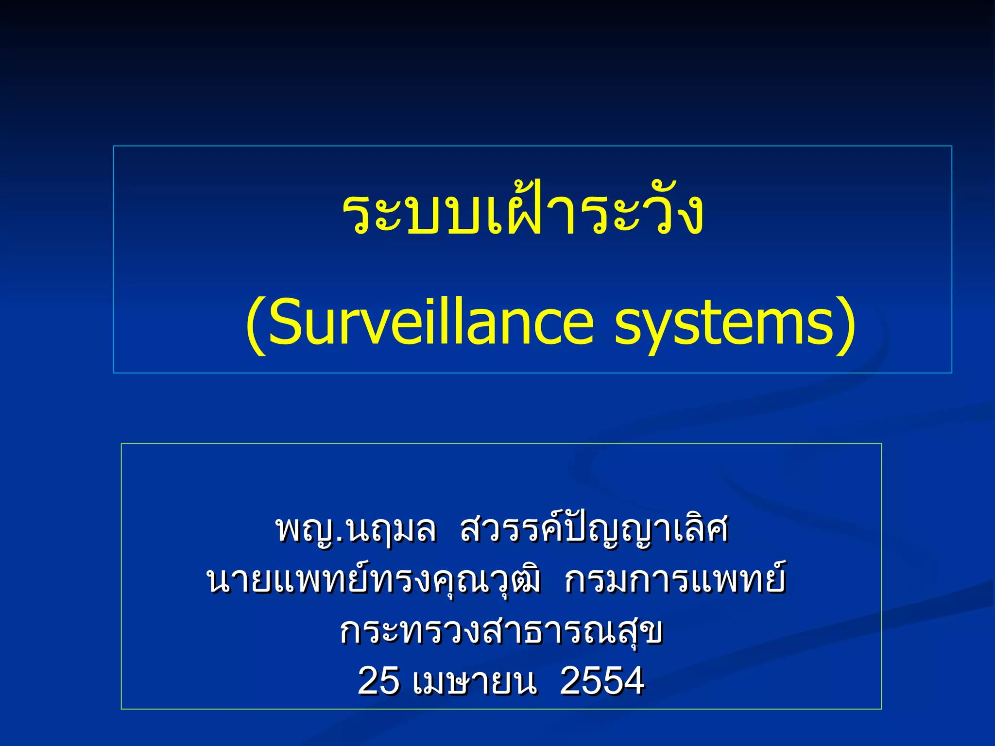 Step 5 Collectand report data Step 6 Analyze and interpret data Step 7 Prepare reports and timely dissemination of information ขั้นตอนการพัฒนาระบบเฝ้าระวัง (2)