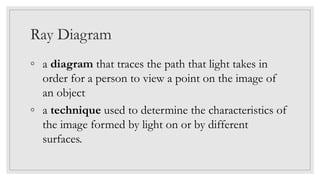 The document provides a comprehensive overview of image formation using concave and convex mirrors, detailing the ray diagram technique, characteristics of images, and the laws of reflection and refraction. It also covers the formation of images through lenses, including the principles governing converging and diverging lenses, with practical exercises and examples for understanding the concepts. Additionally, it offers instructions on how to correctly use optical devices and characteristics of corrective lenses for vision correction.