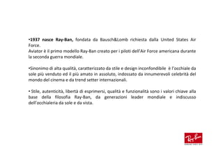 Ray-Ban, fondata nel 1937 da Bausch & Lomb, è sinonimo di occhiali di alta qualità e stile, popolarmente indossati da celebrità e trendsetter. Acquisita da Luxottica nel 1999, l'azienda ha mantenuto la sua leadership nel settore attraverso strategie di marketing innovative e un forte posizionamento del brand. In occasione del 75° anniversario, Ray-Ban ha lanciato un evento musicale e una nuova community online per coinvolgere i consumatori e rafforzare la propria immagine.