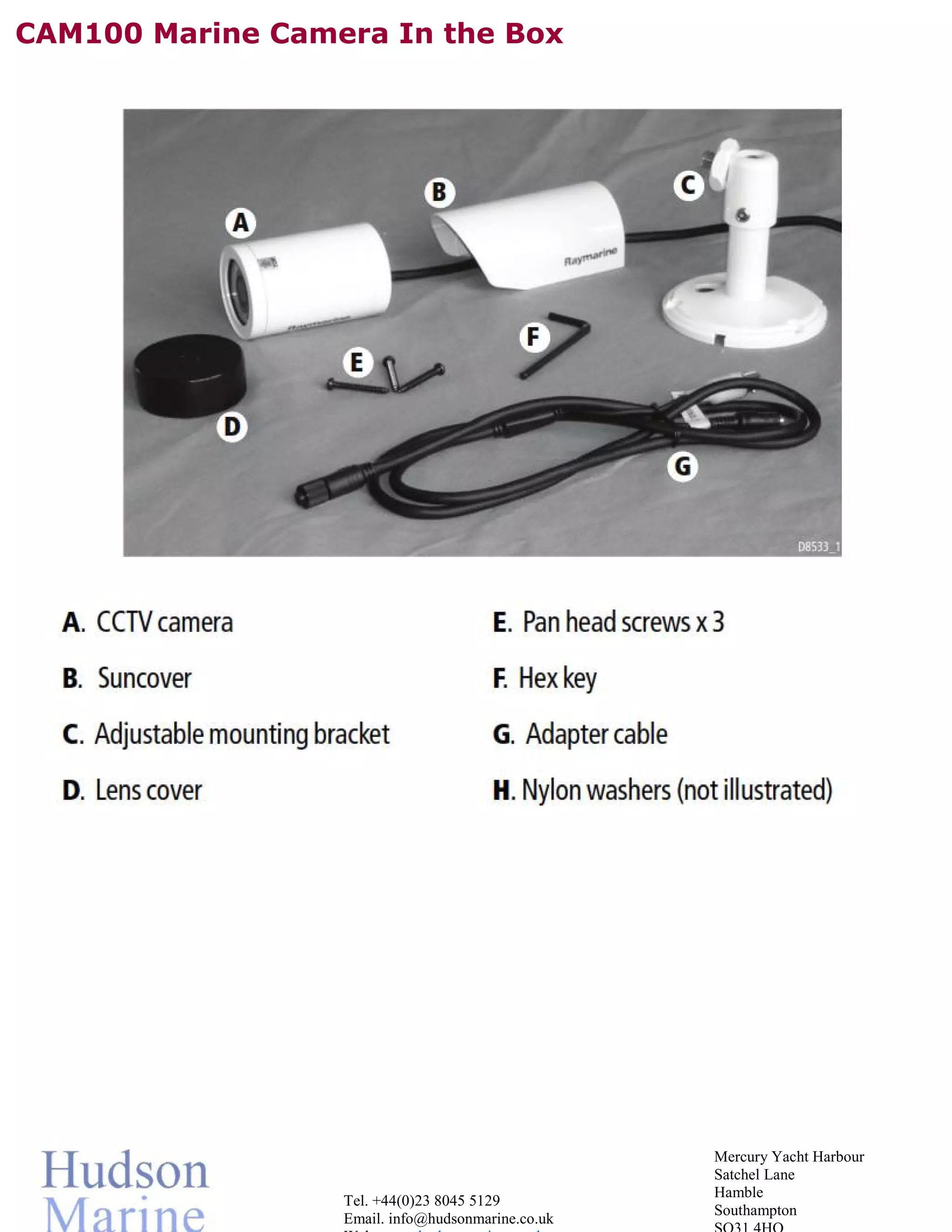 This document appears to be a product description for a CAM100 Marine Camera that comes in a box. It is from Hudson Marine, a company located in Hamble, Southampton, UK that can be contacted via phone or email for more information about the CAM100 Marine Camera or other marine products.